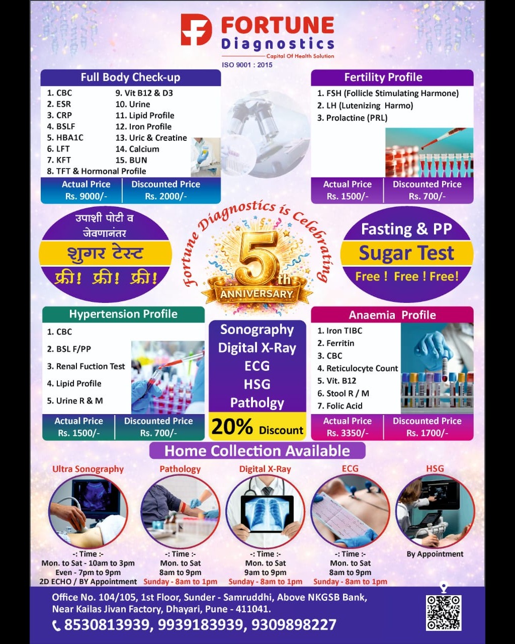 To celebrate our 5th Anniversary, Fortune Diagnostics brings you massive health offers you can’t miss: 🎁 FREE Fasting & PP Sugar Tests 🩺 Full Body Check-up (15 essential tests) for just ₹2000 (Actual: ₹9000) ⚡ Flat 20% OFF on Sonography, Digital X-Ray, ECG, and HSG 🩸 Special discounts on Fertility, Hypertension, and Anaemia profiles! 📍 Location: Dhayari, Pune 🏠 Home Collection Available! 📞 Book Today: 8530813939 | 9939183939 | 9309898227 #FortuneDiagnostics #AnniversaryOffers #HealthCheckup #FreeSugarTest #DhayariPune #PuneHealthcare #FullBodyCheckup #DiagnosticCenter #Pathology #XRay #ECG #Sonography #HealthIsWealth #DhayariLab #HealthcareDeals